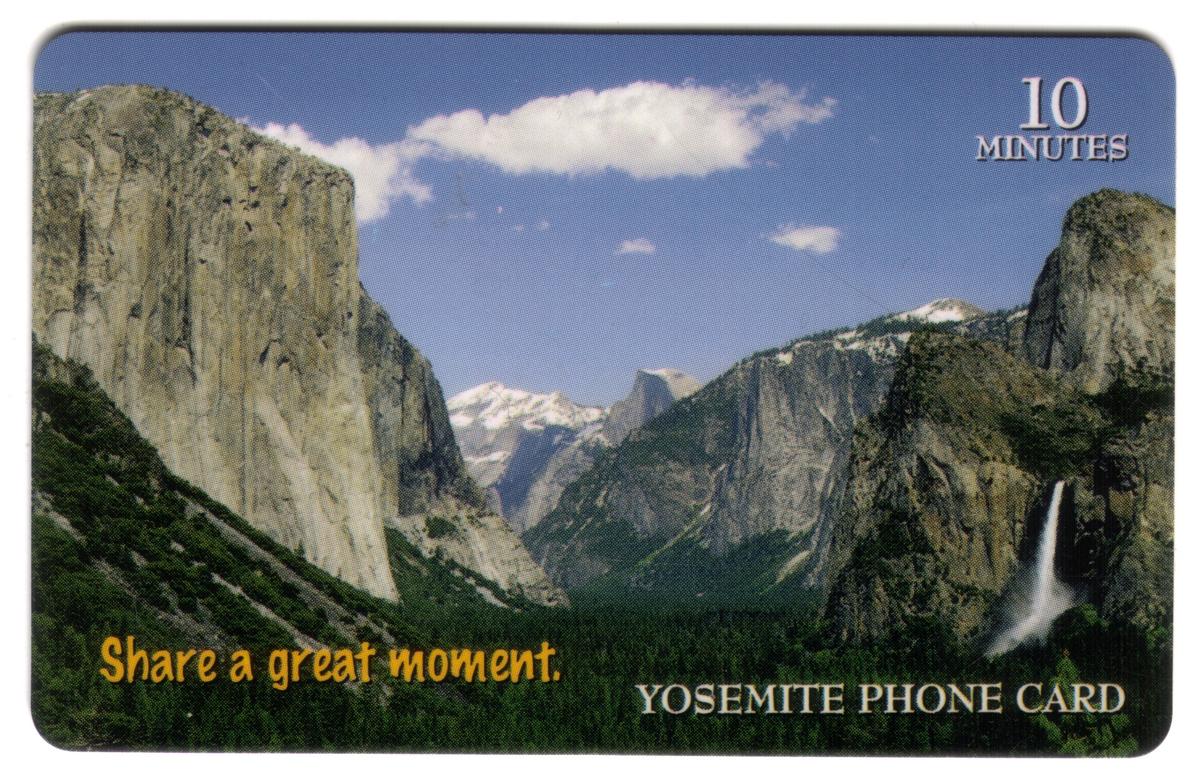 This collectible teledebit card features a scenic photograph of Yosemite National Park, showcasing a waterfall cascading down a rocky face approximately 10 meters in height. The image captures natural beauty with lush green trees surrounding the waterfall, emphasizing the park’s mountainous terrain and rich foliage. The scene is set against a clear sky, highlighting the tranquil and majestic environment typical of Yosemite.