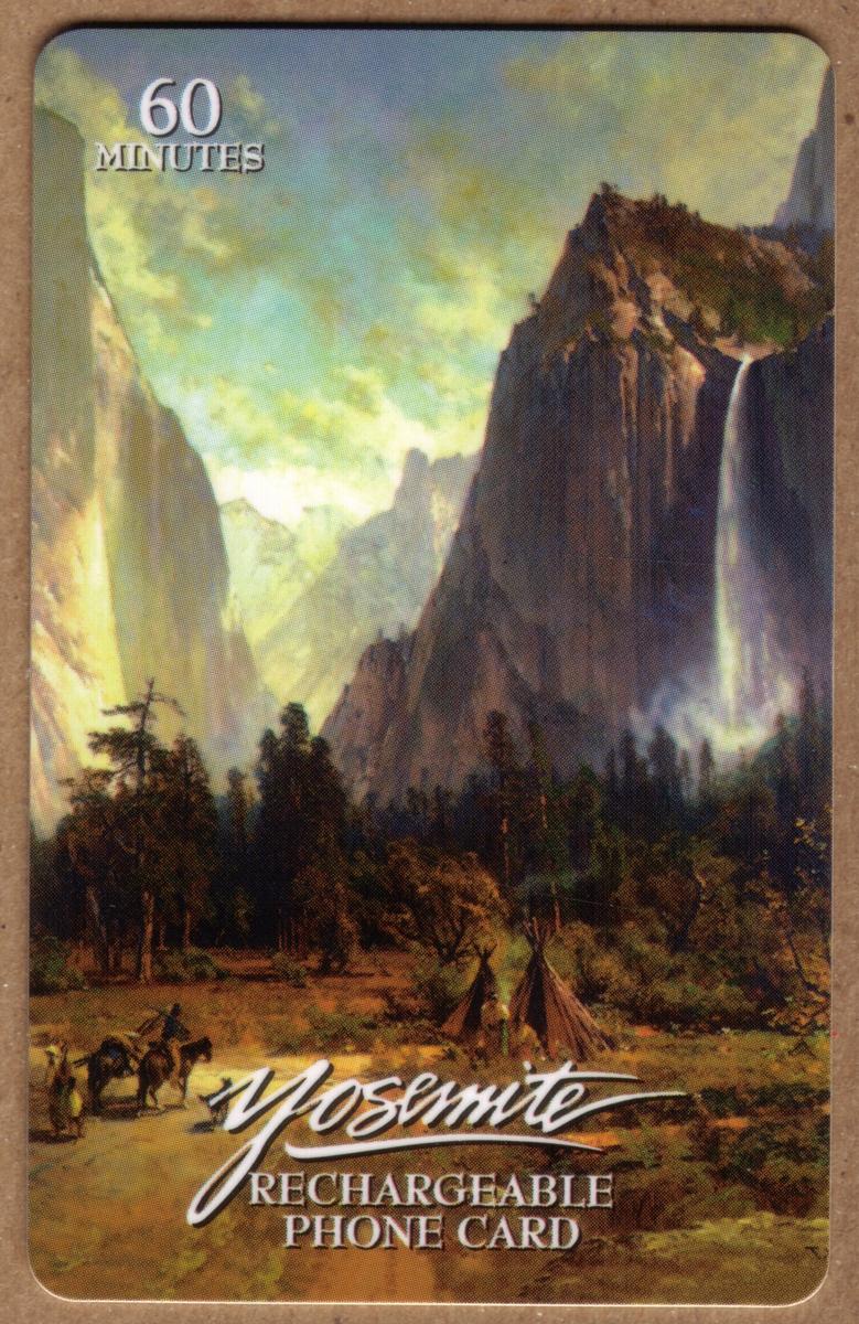 Yosemite National Park themed phone card featuring Yosemite Valley, El Capitan, waterfalls, Native Americans, teepees, and horses, celebrating nature and history. |