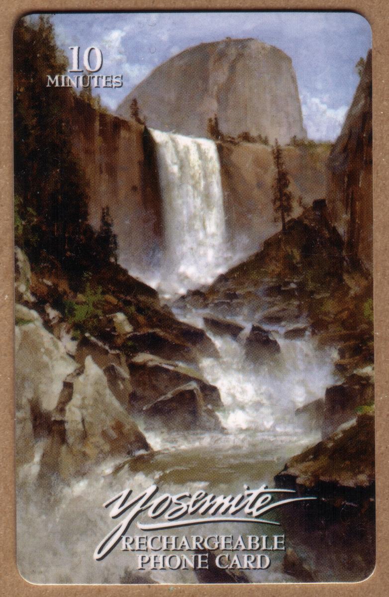 This collectible telecard features a scenic view of Yosemite National Park, showcasing a powerful 10-meter waterfall surrounded by rugged mountains and lush trees. The artwork is created by Thomas Hill, known for his landscape paintings, and captures the natural beauty and grandeur of this iconic park. The scene is vibrant and detailed, emphasizing the sweeping nature of the waterfall and the dense greenery typical of Yosemite’s wilderness.