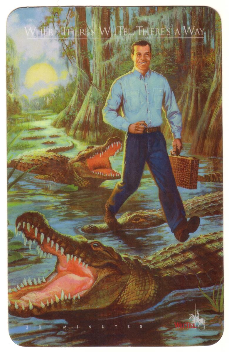The visual style of the card is artistic and detailed, using realistic elements to portray the swamp environment and its inhabitants. The overall presentation combines natural imagery with corporate branding, making this phone card a distinctive collectible within the Wiltel and WorldCom context.