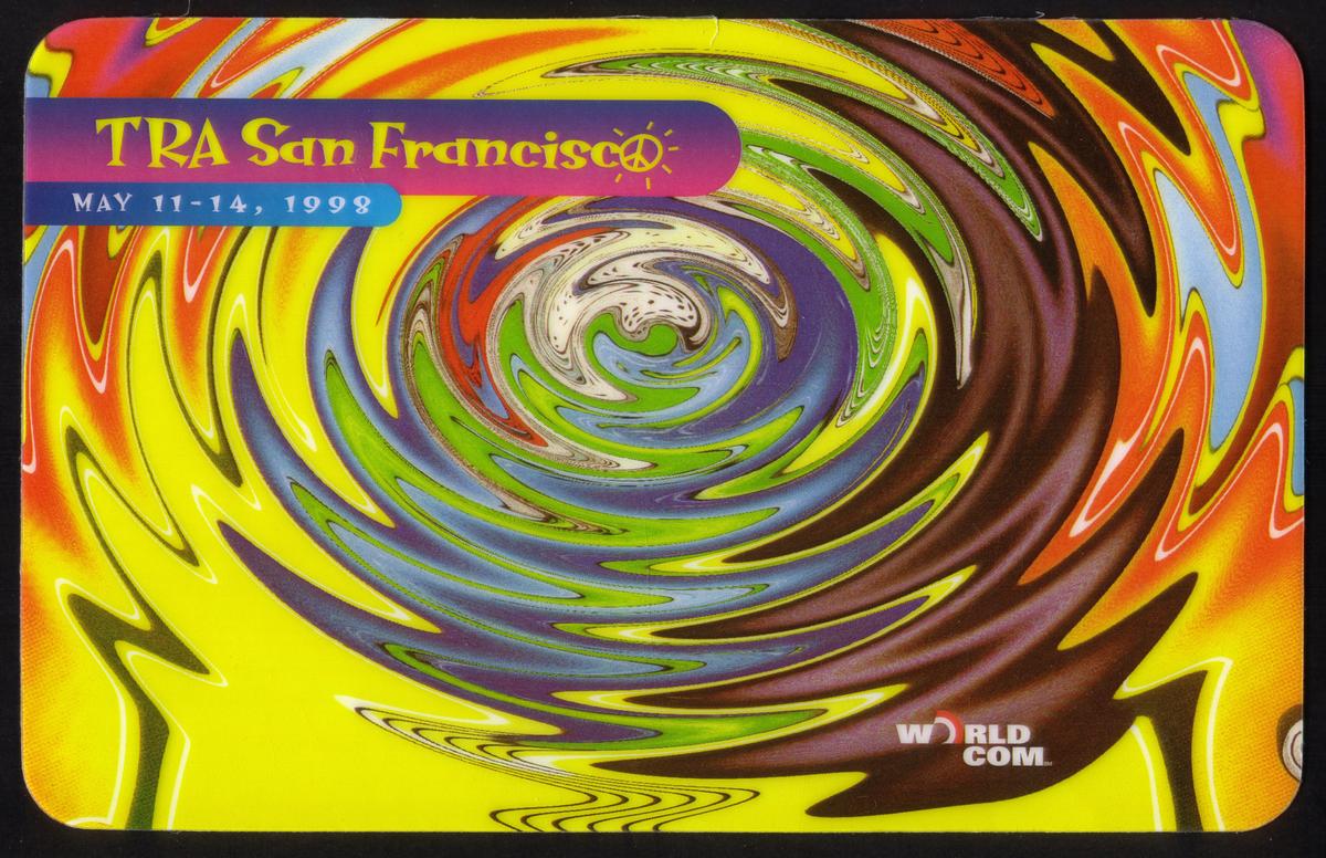 This collectible show card is a promotional item from the WorldCom TRA Conference held in San Francisco in May 1998. The card features colorful, artistic artwork prominently displaying the telecommunications resellers association (TRA) logo. The design emphasizes vibrant hues with a modern, corporate aesthetic reflecting WorldCom’s brand identity during that period. The text on the card includes references to "California 30m," indicating the card’s value or relevance to the conference event.