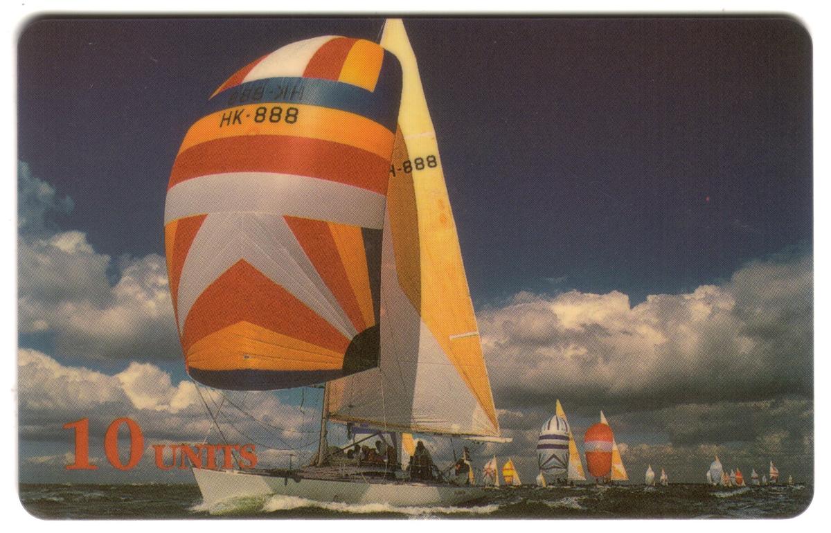 This collectible card features a vibrant image of a 10u sailboat race taking place on open water. The scene includes several small sailboats with their sails fully raised, engaged in competitive sailing. The boats are positioned on a calm body of water under clear blue skies, which provide bright natural lighting and enhance the detailed colors of the sails and boats. The composition emphasizes the dynamic and spirited nature of the sailing competition.