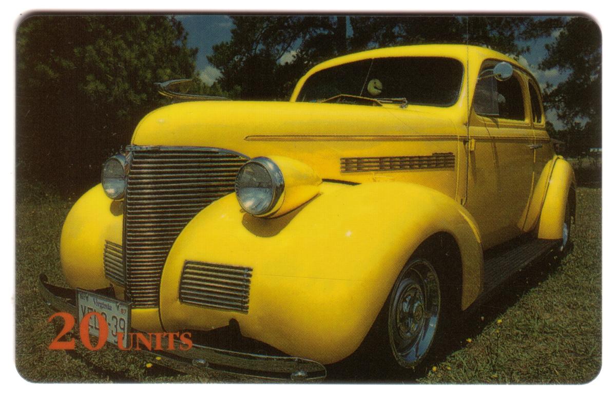 This collectible chip card features a 1939 Yellow Chevrolet Street Rod Coupe, a classic automobile highlighted in bright yellow color. The car’s design captures the vintage style characteristic of the late 1930s, showcasing smooth curves and detailed features like chrome accents and a streamlined body. The image appears to emphasize the car’s distinct classic look, representing automotive history and classic car culture.