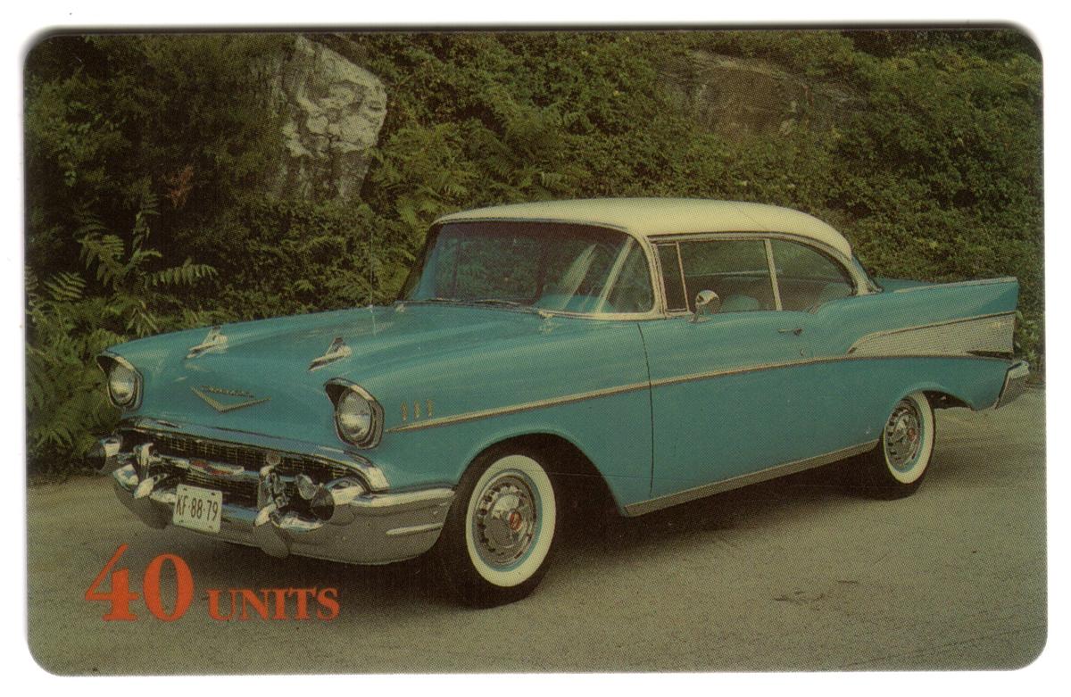 This collectible chip card features a vivid image of a classic 1957 Chevrolet Bel Air automobile. The car is predominantly blue with a white roof, showcasing the iconic design elements of the 1950s American automotive style. The photograph captures the vehicle in a three-quarter front view, highlighting the detailed chrome trim, signature front grille, and distinctive two-tone paint job typical of the Chevrolet Bel Air models. The car rests on a paved street, set against a subtle outdoor background that emphasizes its well-preserved condition.