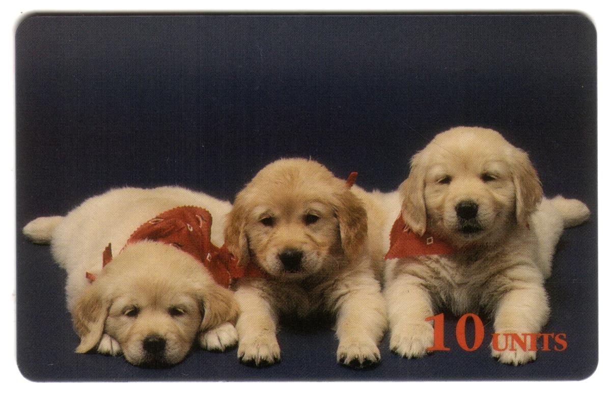 This card is associated with the Sprint brand and emphasizes dogs and dog breeds, specifically golden retriever pups wearing colorful scarves. The card combines animal photography with branding elements, making it both a collectible and a representation of Sprint’s promotional or thematic material involving animals.