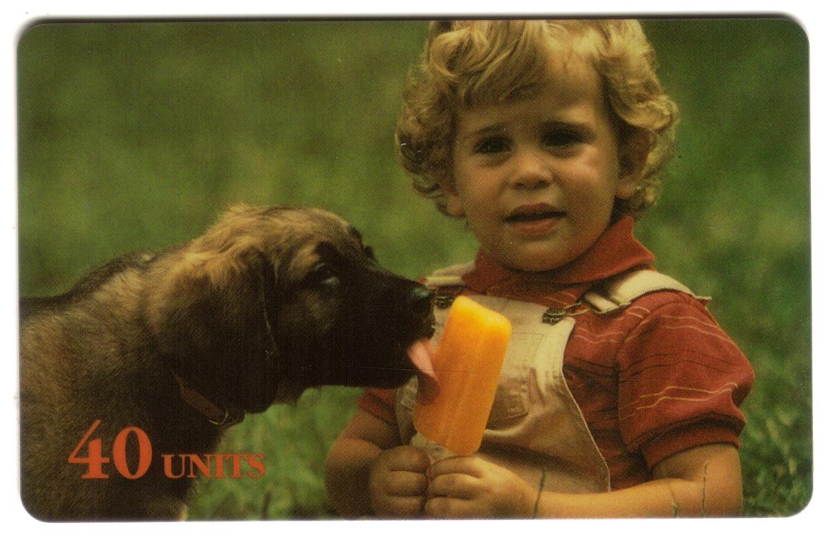 This collectible card features a color photographic image of a young child holding a puppy dog. The child and puppy are both engaging with a large popsicle. The puppy is licking the popsicle while the child holds it securely with both hands. The child has a joyful expression and is dressed in casual clothing. The setting appears outdoors, with natural lighting highlighting the scene.