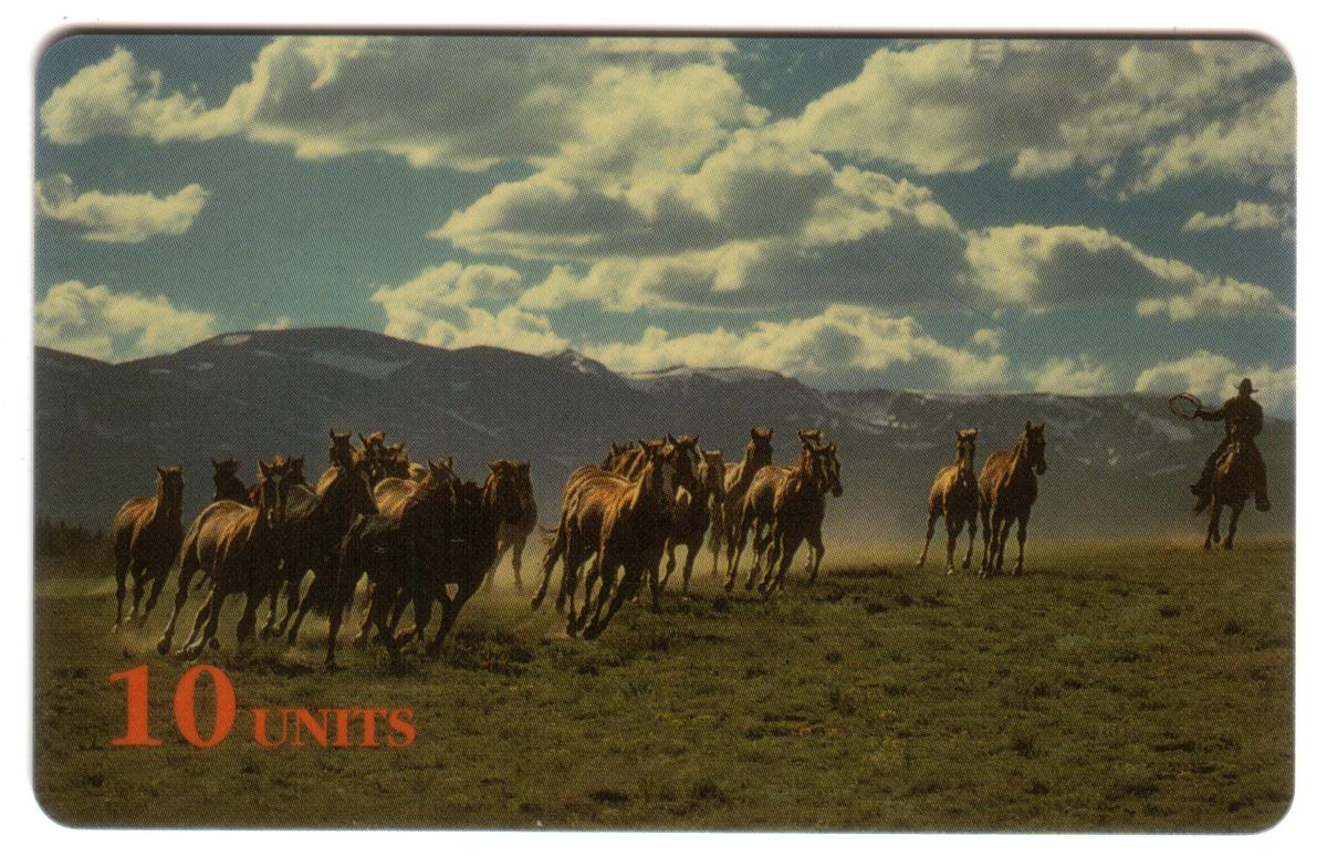 This collectible phone card features a scenic depiction of a herd of horses running freely across an open range. The horses appear in various shades of brown, black, and white, captured mid-stride on a grassy plain that extends into the distance. Towering mountains rise in the background under a clear sky, creating a dramatic and natural landscape. Small groups of trees and shrubs dot the expansive plains, enhancing the wild and untamed atmosphere of the scene.