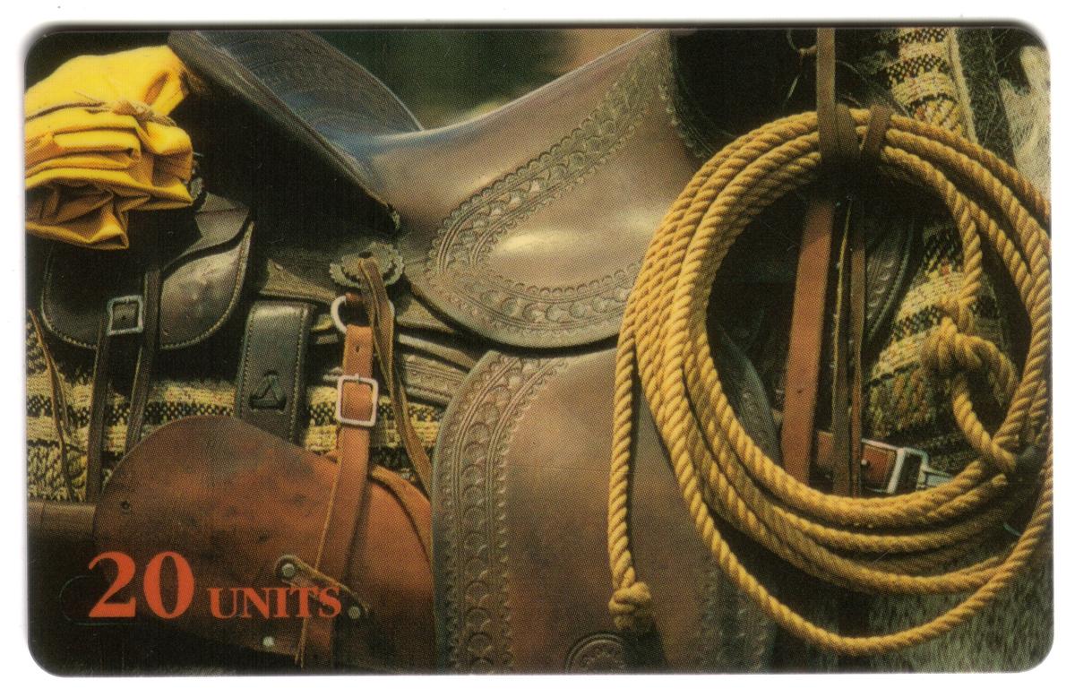 This collectible chip card features vibrant imagery centered on the theme of horses and cowboys. The main focus is a detailed horse saddle and rope, emphasizing classic Western cowboy gear. The saddle is intricately detailed with leather textures and craftsmanship, accompanied by a coiled rope laid prominently nearby. The background supports the Western motif with natural, earthy tones.