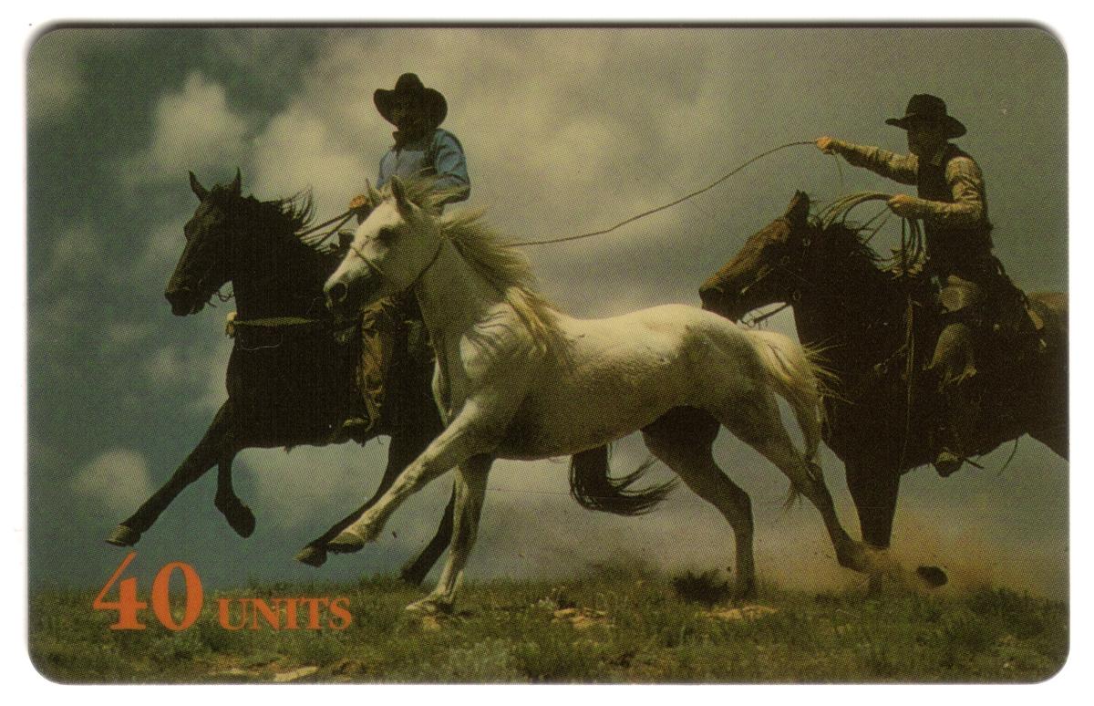Overall, this collectible phone card illustrates the excitement and culture of cowboy life and rodeo sports through its detailed imagery of horses, riders, and the action of roping a wild horse. The card is a part of a series titled "40u Cowboys Roping A Wild Horse" and is identified as a Proof variant. The use of strong, bold visuals highlights both the animals and the cowboy figures prominently.