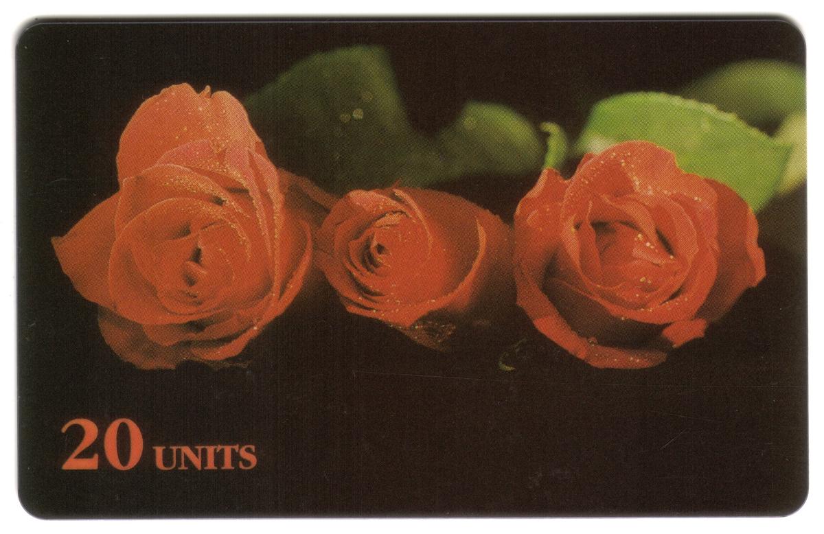 This collectible phone card features a vibrant and detailed image of red roses. The flowers are arranged closely together, showcasing their rich red petals and lush green leaves. The composition emphasizes the natural beauty and vivid colors of the roses, highlighting their texture and depth.