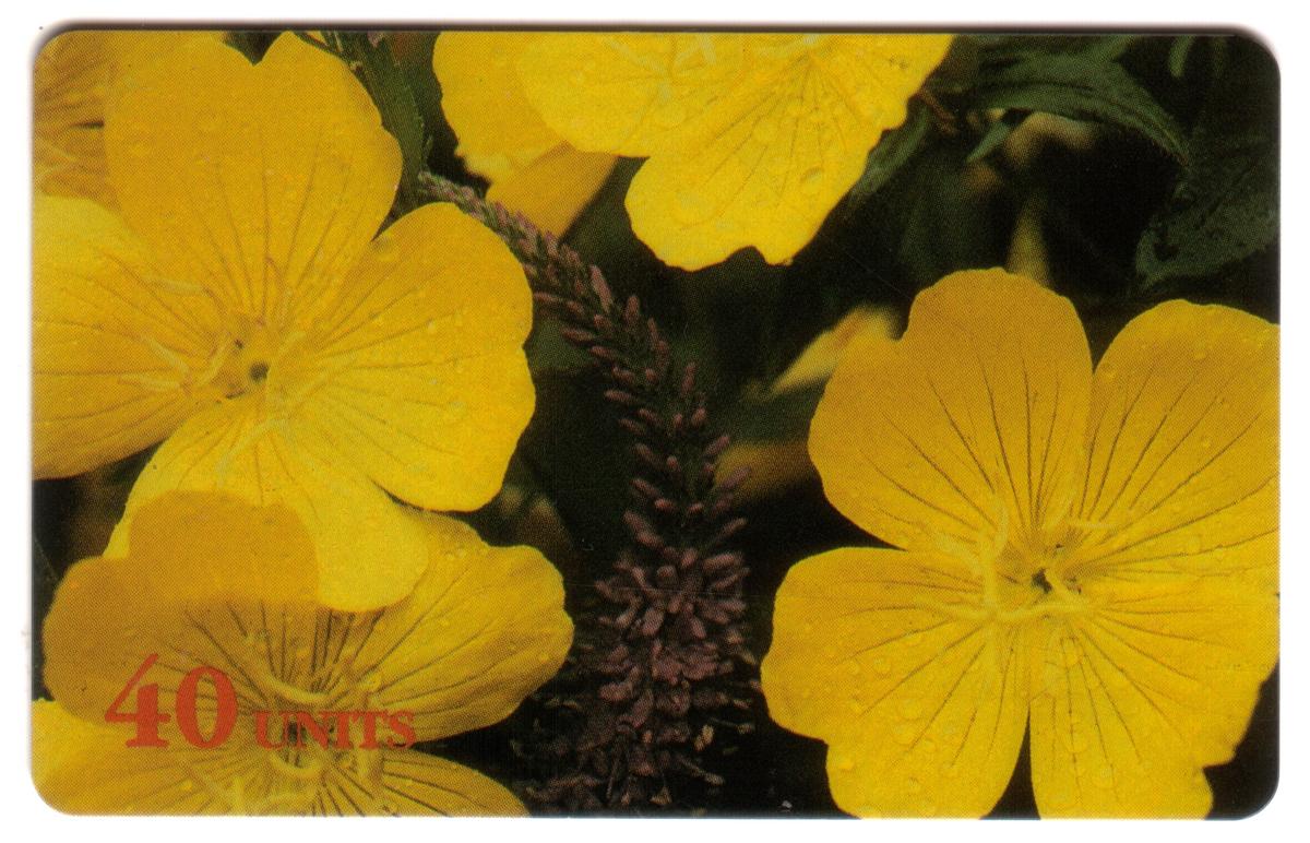 This collectible phone card features vibrant yellow poppies as its central theme. The image showcases a cluster of bright yellow poppy flowers among green leaves and stems, with clear details of the petals and natural textures. The composition emphasizes the delicate beauty of these florals, highlighting the rich yellow hues contrasted against fresh green foliage.
