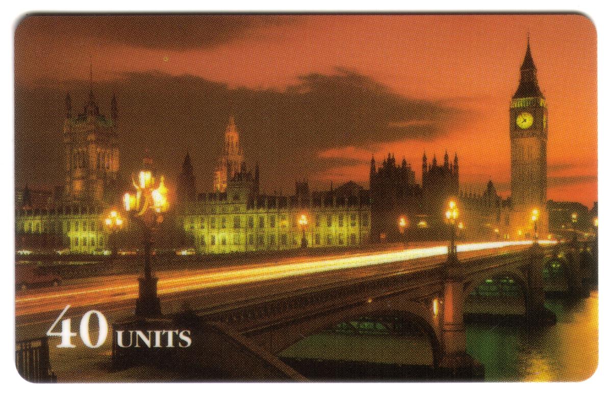 The card is marked with the denomination "40 UNITS" in white text on the bottom left corner. The design captures a classic and well-known London landmark, emphasizing both architectural detail and atmospheric lighting to create a striking travel and sightseeing theme. The overall mood highlights the historic and cultural significance of this famous London scene.