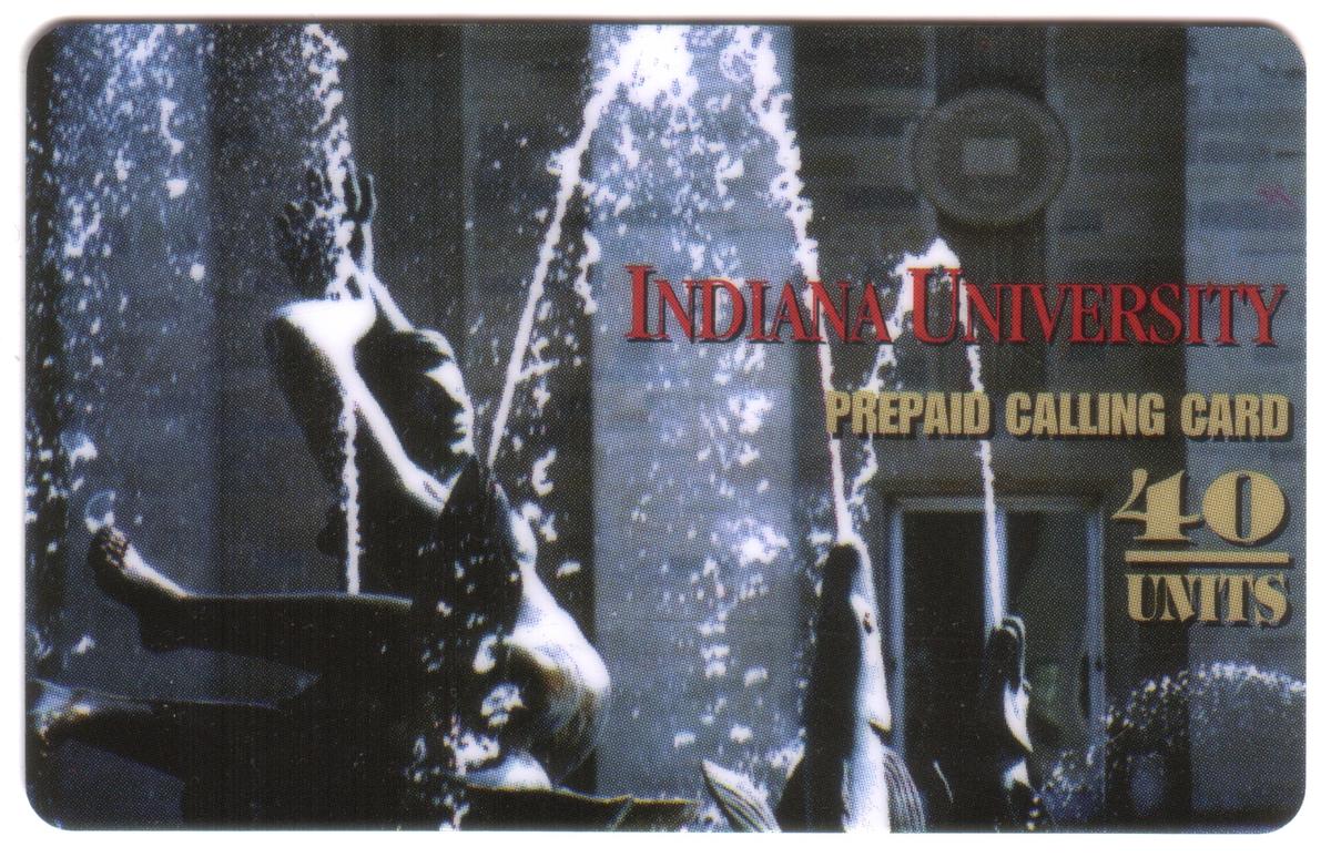 This collectible phone card features imagery related to Indiana University, showcasing elements connected to education and the campus environment. The front of the card highlights a prominent water fountain situated within the university grounds, symbolizing a place for gathering and campus life. The design emphasizes themes of higher learning, with the inclusion of the Indiana University branding and the “iu call” logo, underscoring telecommunications associated with the school.