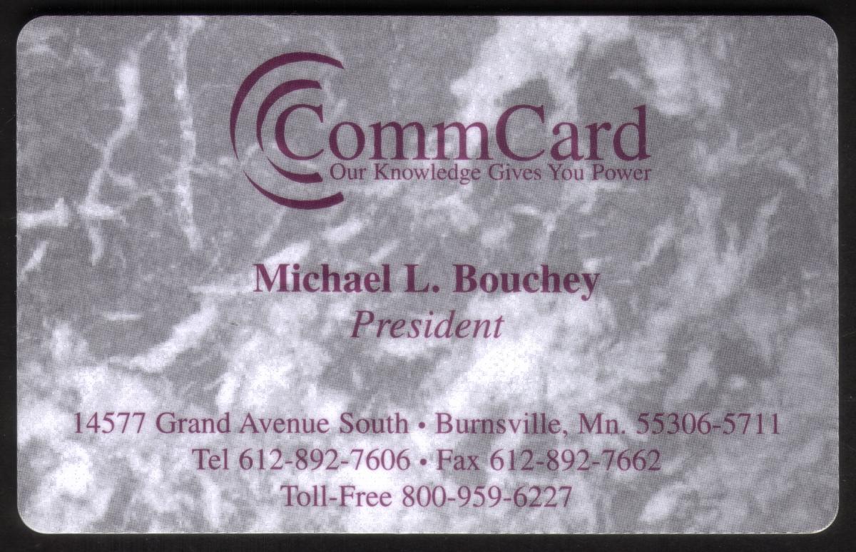 This collectible phone card from CommCard, Inc. features an image of Michael L. Bouchey, identified as the President of CommCard. The card displays a professional portrait of Bouchey in formal attire, standing against a neutral background. The text on the card includes “our knowledge gives you power” and “Burnsville Minnesota,” indicating a connection to that location. The design prominently includes the CommCard brand name and logo.
