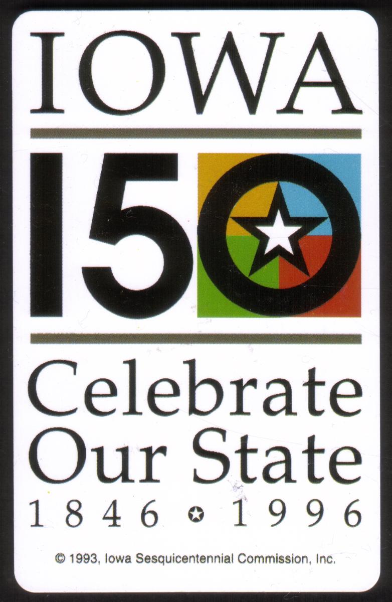 This collectible set consists of two phone cards produced by Strategic Telecom Systems commemorating the Iowa Sesquicentennial from 1846 to 1996. Both cards feature vibrant illustrations celebrating 150 years of Iowa statehood as recognized by the Iowa Sesquicentennial Commission. The front of each card prominently displays the text "150 years Iowa Sesquicentennial 1846-1996 Celebrate Our State," highlighting the milestone anniversary.