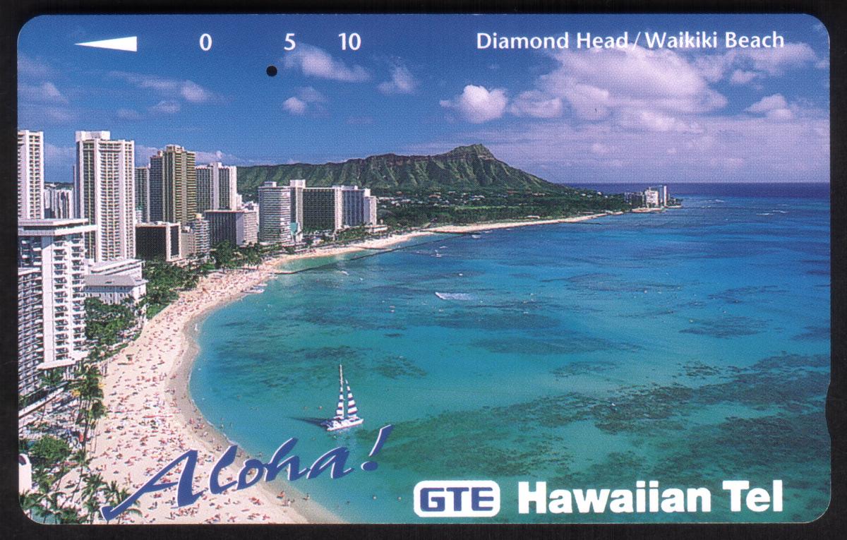 Overall, this phone card captures the essence of Hawaii’s famous landmarks and beaches, combining the scenic coastline, palm trees, and clear skies to create a collectible item for those interested in Hawaiian travel and sightseeing.