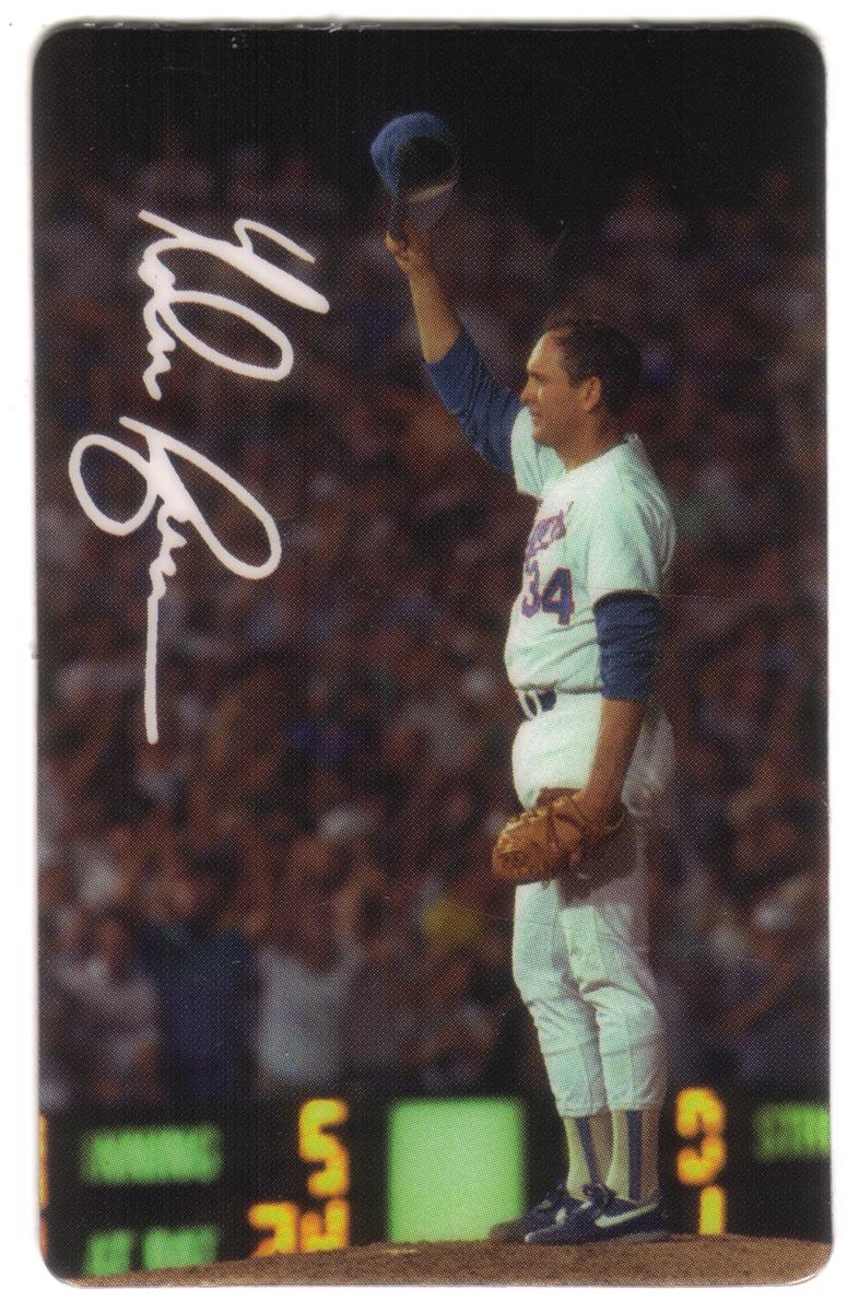 The card combines themes of sports history and telecommunications, showcasing Nolan Ryan in a celebratory pose. The combination of professional sports photography and the card’s collectible nature makes it a notable item for baseball enthusiasts and card collectors.