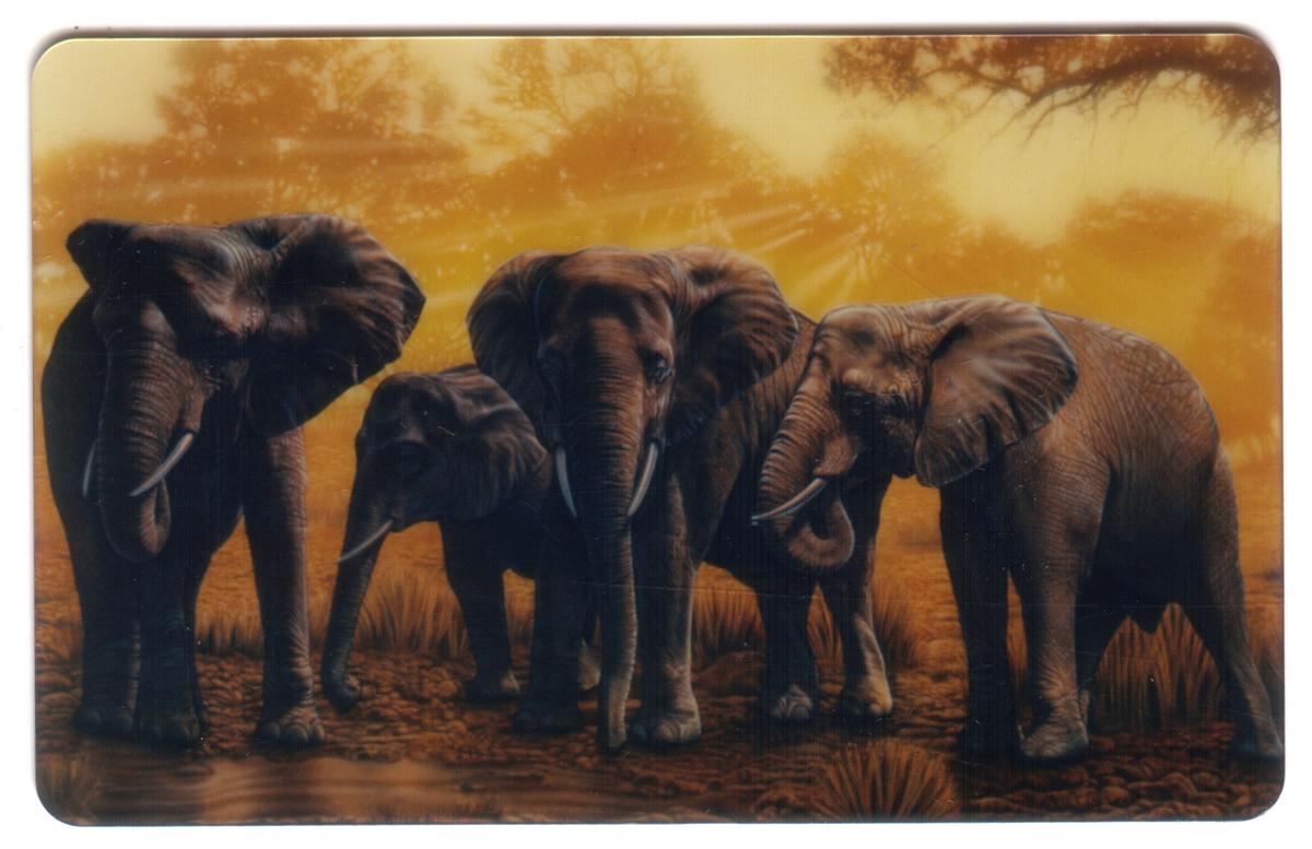 This collectible phone card features a vibrant artwork depicting a sunset scene on the Serengeti with a group of African elephants. The artwork showcases warm orange and yellow hues of the setting sun blending into the sky, casting a golden glow over the landscape. The elephants are shown in various poses, some standing and others walking, creating a dynamic and naturalistic portrayal of these animals in their habitat.