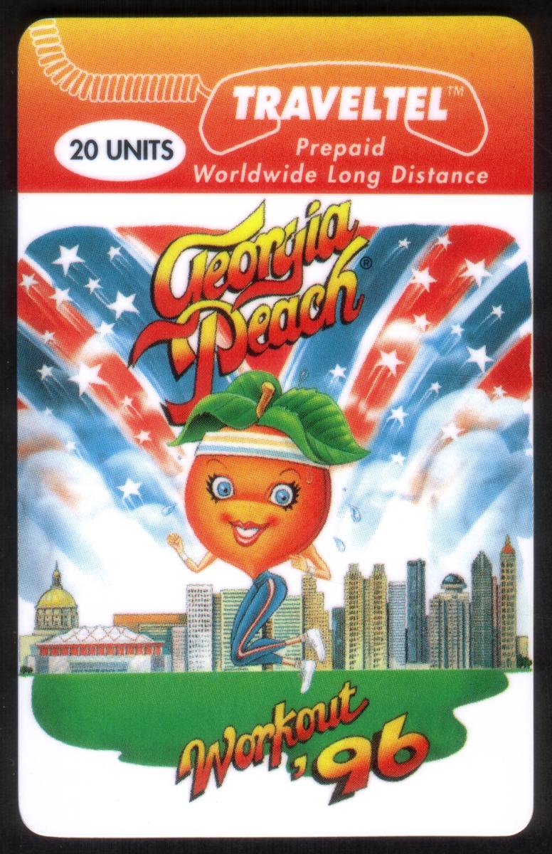 The card’s top left corner includes the logo and text for "TravelTel Phone Cards," indicating the brand and type of collectible. The overall design uses bright and engaging colors, balancing the cartoon character with a detailed city illustration. The card represents both a cultural and artistic celebration of fitness within the Atlanta metropolitan area during the mid-1990s.