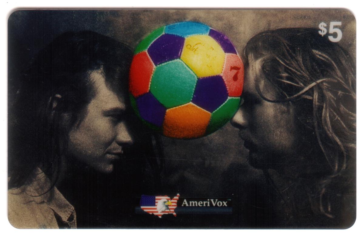 In the bottom center of the card, there is a small logo with the American flag stylized inside the outline of the United States accompanied by the text "AmeriVox." The card’s monetary value "$5" is prominently displayed in white in the upper right corner. This phone card combines elements related to soccer, international culture, and multicultural unity through its imagery and branding.