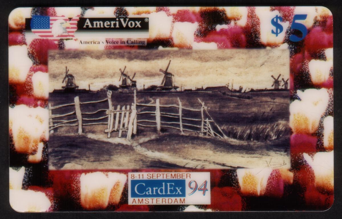 The card is issued by AmeriVox, marked prominently with the AmeriVox logo and the slogan "America's Voice in Calling" near the top left corner. Its face value is $5, clearly displayed in blue text at the top right. At the bottom center, the card commemorates the CardEx 1994 Expo held in Amsterdam from September 8-11, 1994, as indicated by the label "CardEx 94 AMSTERDAM."