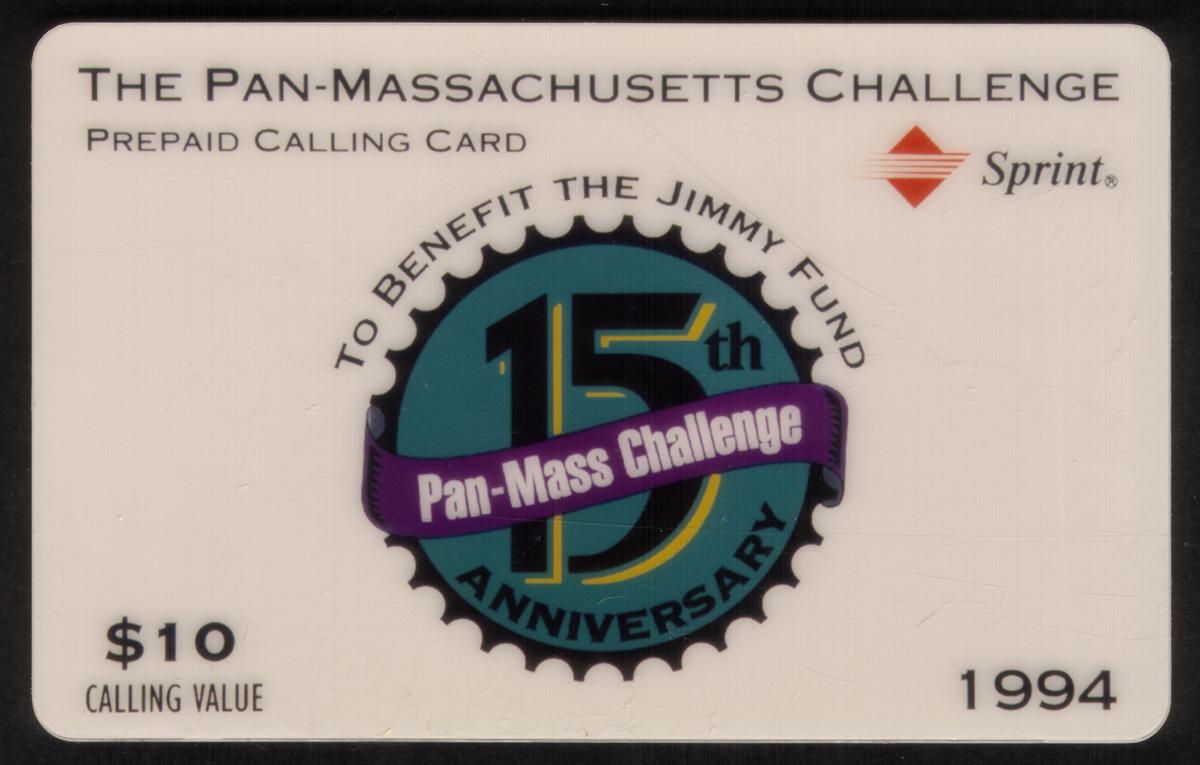 The collectible phone card commemorates the 15th Anniversary of the Pan-Massachusetts Challenge, an annual athletic charity event focused on cancer research and health-related causes. It prominently features logos and trademarks associated with the Jimmy Fund Benefit and the Pan-Massachusetts Challenge bike-a-thon held in 1994. The card is valued at $10 and was issued by Sprint.
