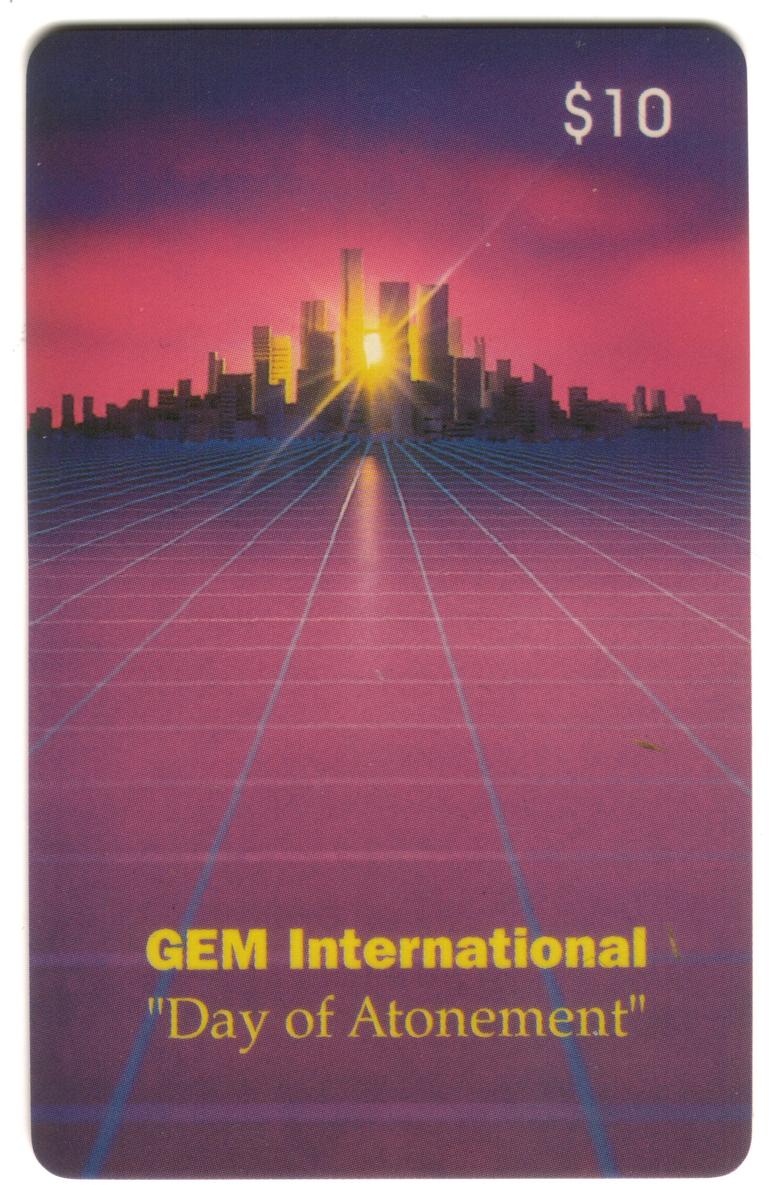 The card’s design highlights American historical sights and American icons related to New York, NY, reflecting a significant moment tied to American history. The words "Day of Atonement: Sun Shining Through New York Skyline (1994)" are printed alongside "GEM International," indicating the card’s association with this series and date. The brand Teltrust is visible, along with a $10 denomination printed on the card.