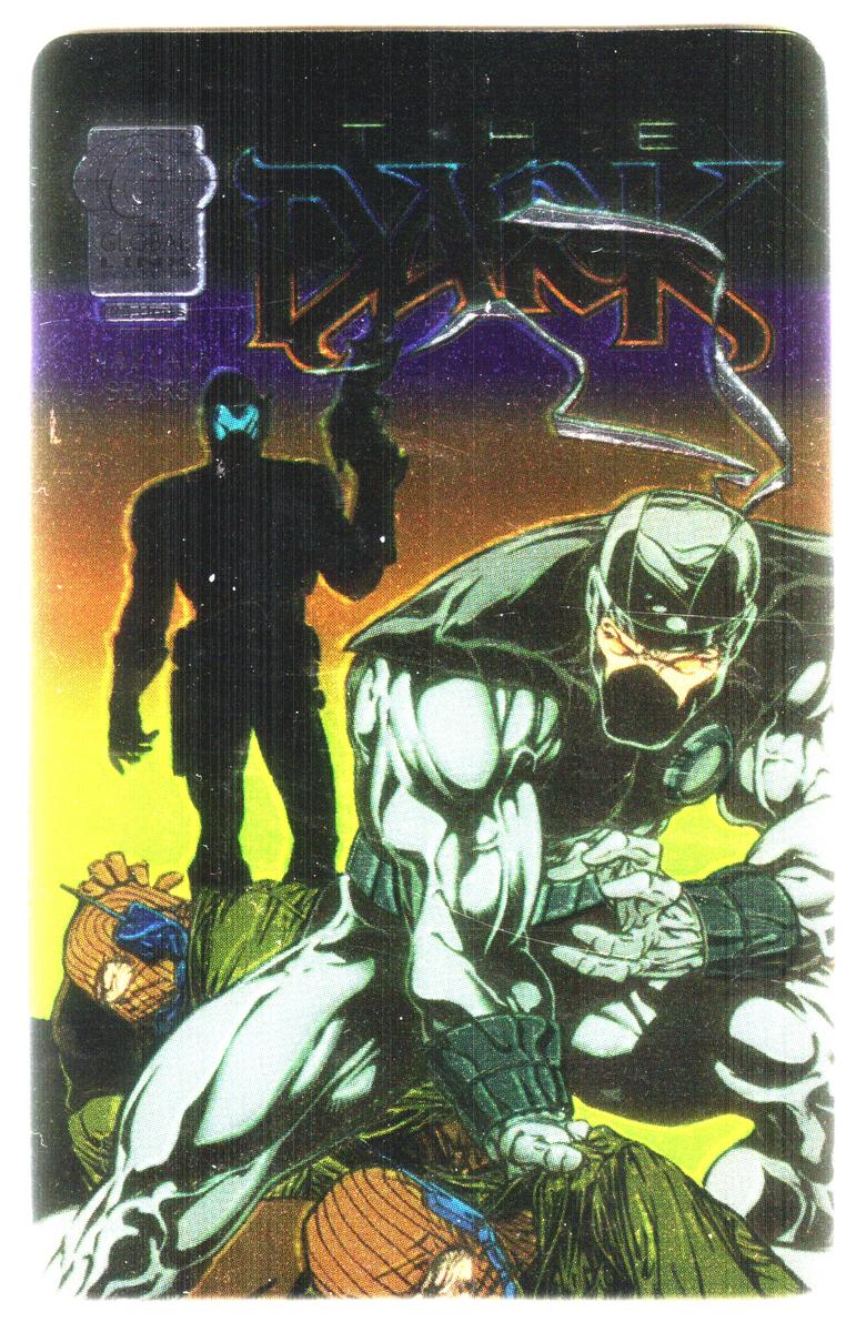 This collectible phone card features artwork titled "The Dark" Artwork #2 by Naftali Sears, also known as Bart Sears. The image depicts a detailed fantasy cartoon style character, illustrated with bold lines and rich shading. The character is a muscular figure holding a large weapon, dressed in armor with a helmet. The overall color scheme leans toward darker tones with contrasting highlights that emphasize the character’s form and expression.