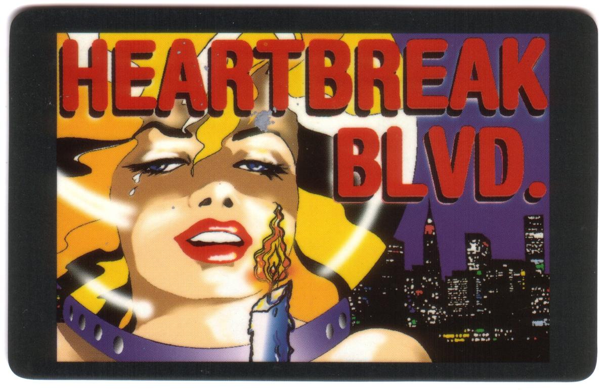 The second card in the set presents a colorful street art mural style illustration titled "Heartbreak Blvd." It displays a glamorous woman with blonde hair, red lipstick, and light makeup. The background includes a nighttime city skyline with lit windows and tall buildings in black silhouette, giving the impression of an urban setting. The large red and orange lettering "HEARTBREAK BLVD." dominates the top half of the card.