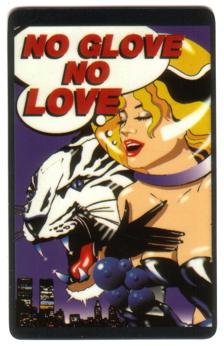 The third card, "No Glove No Love," continues the vibrant comic art style with a blonde woman wearing a large white cowboy hat and screened gloves. She is posed with eyes closed in front of a white tiger baring its teeth and pink tongue. The tiger and woman appear in front of a dark purple backdrop featuring a nighttime city skyline with small yellow and white light dots resembling buildings’ windows. A speech bubble near the woman’s head contains the red text "NO GLOVE NO LOVE," reinforcing the card's safety promotion.