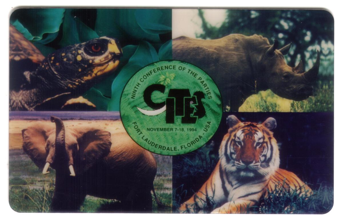 Endangered species conservation tribute featuring a turtle, rhinoceros, elephant, and tiger from CITES COP9 1994 in Fort Lauderdale. |