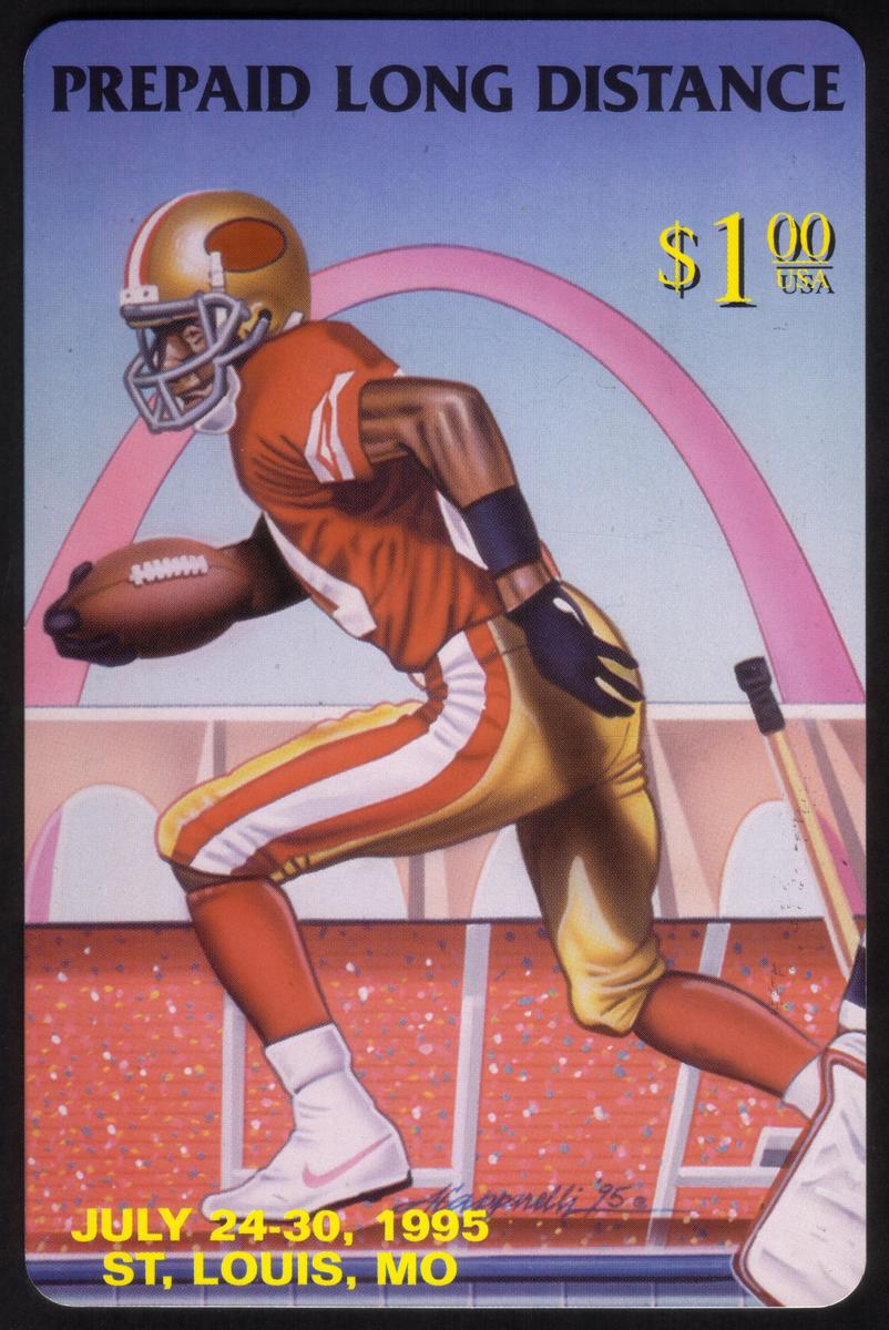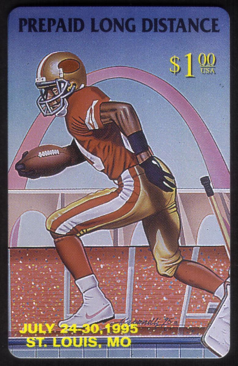 The first card depicts a football player in an orange and gold uniform running with the ball. The iconic St. Louis Arch is prominently shown in the background behind the player, and the card’s bottom text notes the date and location of the convention: "JULY 24-30, 1995 ST. LOUIS, MO." The top of the card reads “PREPAID LONG DISTANCE.”