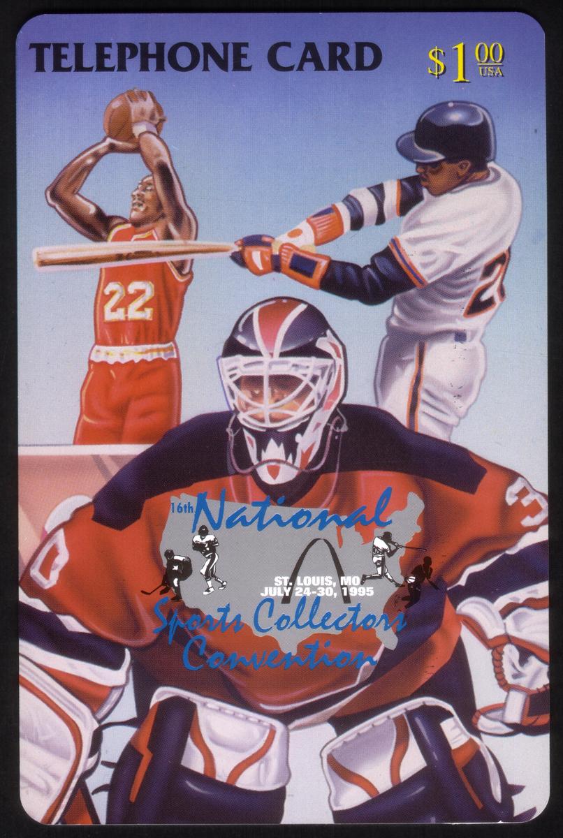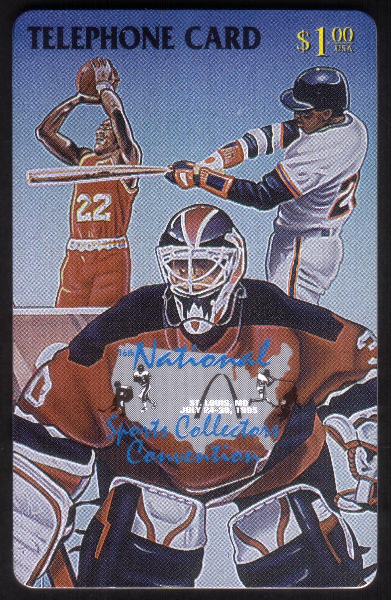 These collectible telephone cards are from the 16th National Sports Collectors Convention held in St. Louis, Missouri, from July 24-30, 1995. Each card has a prepaid long distance or telephone card designation with a face value of $1.00 USA. The designs feature sports imagery related to hockey, baseball, and basketball.
