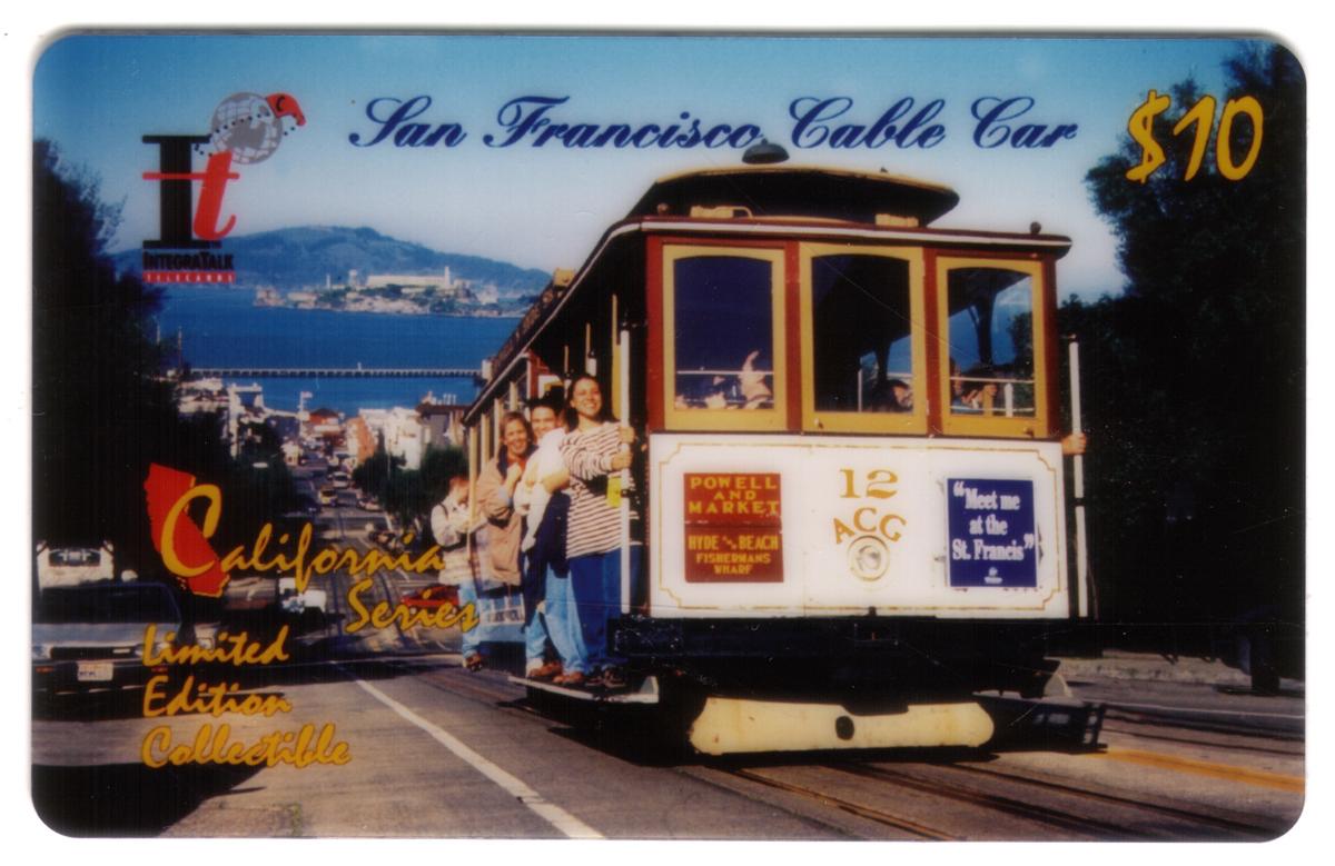 Text on the card includes "Meet Me at the St Francis $10," referencing the famous St. Francis Hotel in San Francisco, along with the location specific to the cable car route—Powell and Market. The design incorporates the title "California Series" and "Integrity Telecom," indicating the issuing company. Additional text features "12 ACG," connecting it to the collectible phone card series. Visual elements connect to Fisherman’s Wharf, a renowned tourist destination in California, emphasizing the card’s theme of travel and sightseeing.