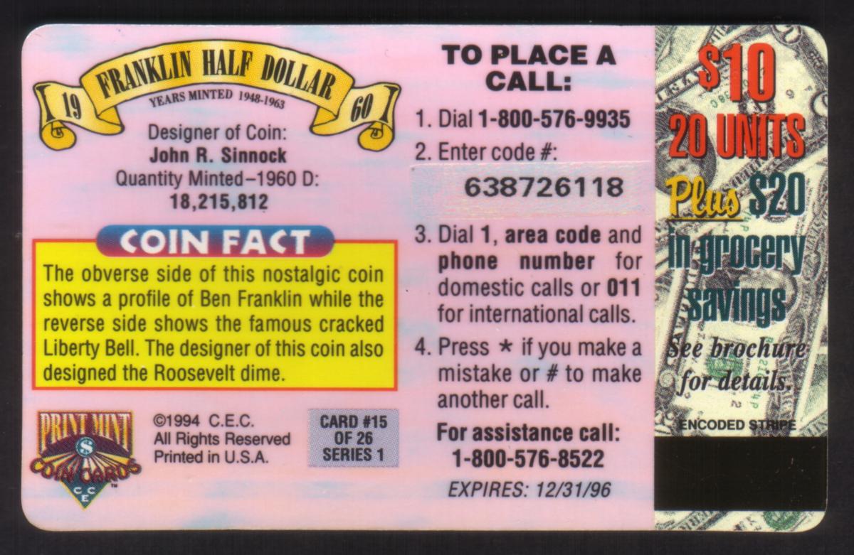 This card is part of the WorldCall 2000 series, linked to Collectors Exchange Cartel, known for Americana, coins, currency, sightseeing, and travel collectibles. The design references John R. Sinnock, the engraver of the Franklin Half Dollar, and includes the Liberty Bell image from the coin design. The card blends numismatic and travel elements, celebrating both a notable U.S. coin and a famous American national monument.