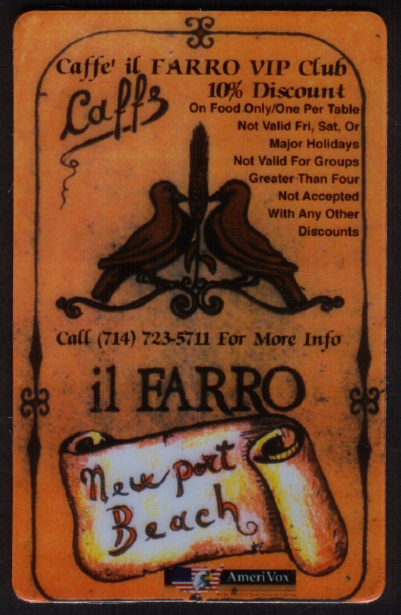 Overall, the card highlights a dining-related promotion connected with the Caffe’ il Farro VIP Club in Newport Beach, California, while showcasing the image of colorful lovebirds. The inclusion of a phone number provides direct contact information for the restaurant, integrating travel, dining, and communication themes in the design.