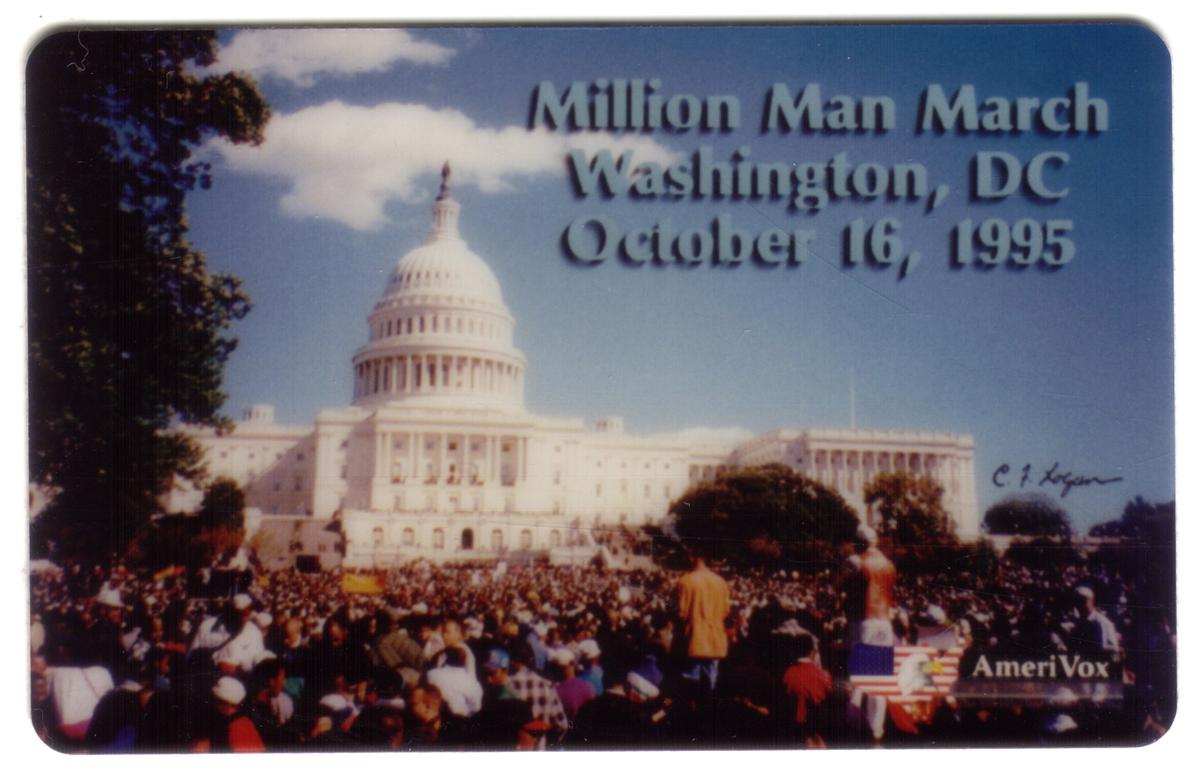 This collectible phone card commemorates the Million Man March held on October 16, 1995. The card features a photographic image of a large crowd of demonstrators gathered near the United States Capitol Building in Washington, D.C., during the march. The photograph captures the energy and scale of the event, showing many participants actively engaged in the political action and protest.