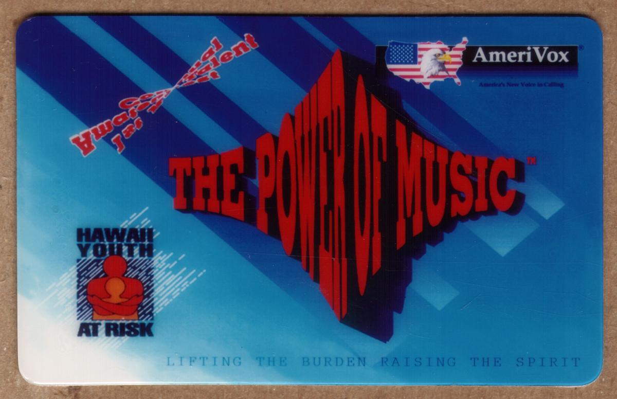 The collectible phone card titled "The Power of Music - 'Hawaii Youth At Risk'" features vivid imagery related to Hawaiian culture and youth empowerment. The central visual shows a young Hawaiian individual playing a guitar, symbolizing the uplifting and inspiring role of music. The background includes a subtle, calming display of large tropical leaves and a serene backdrop that evokes the natural beauty of Hawaii.