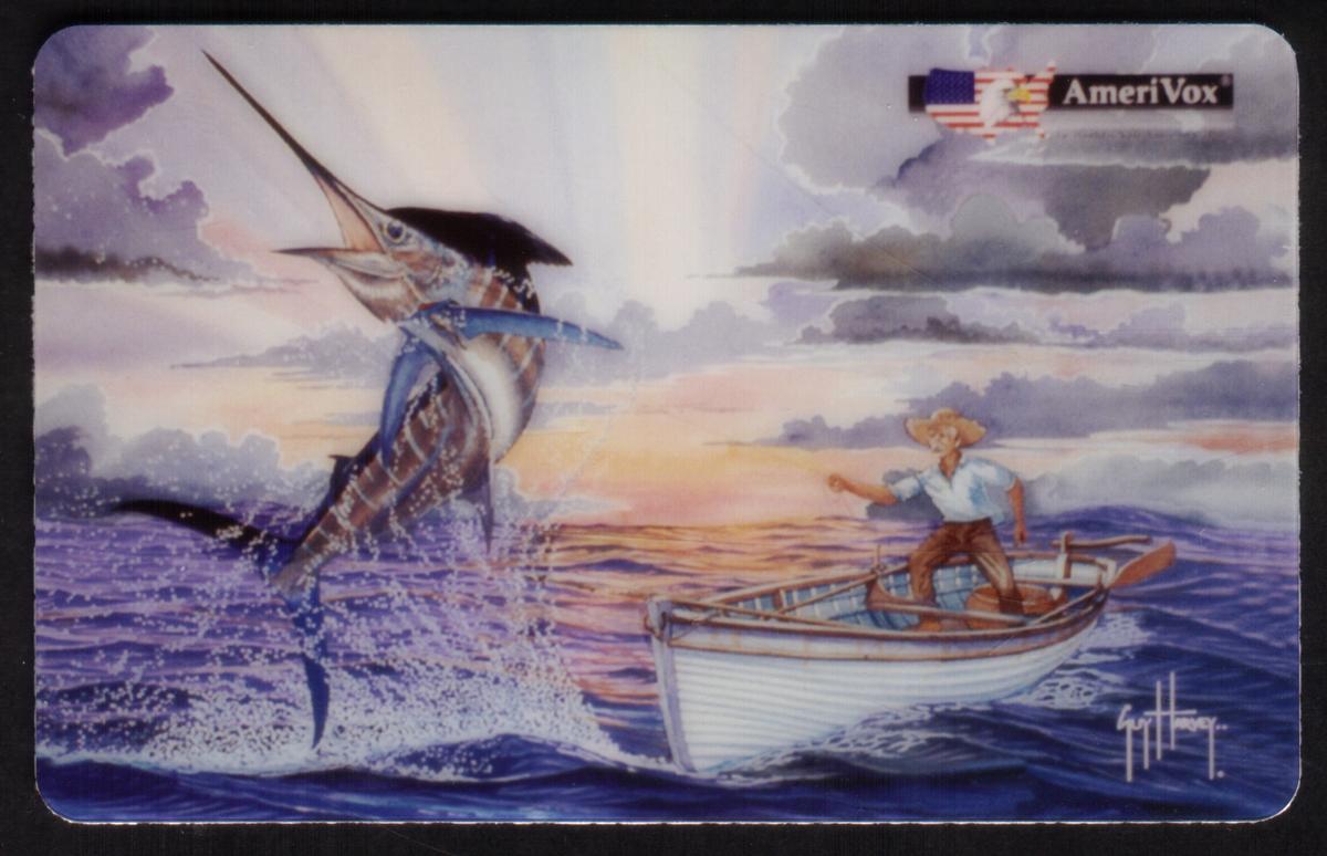 The card displays the words "AmeriVox" prominently, indicating the issuing entity, which is associated with telecommunication services. The presence of the fishing boat, the swordfish, and the ocean scene reinforce the theme of maritime sport fishing, a subject commonly explored in Guy Harvey’s work.