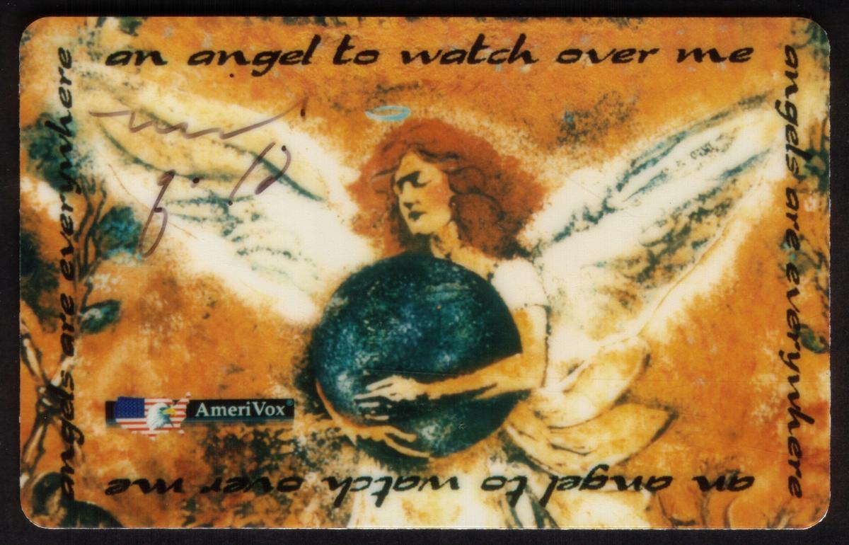 The card bears the branding of AmeriVox and the phrase "Angels Are Everywhere" is prominently displayed on the front. The overall artistic style is elegant and peaceful, emphasizing the theme of spiritual protection. This card is part of a series focused on angels, reflecting artistic and thematic elements consistent with the mid-1990s era of collectible cards.