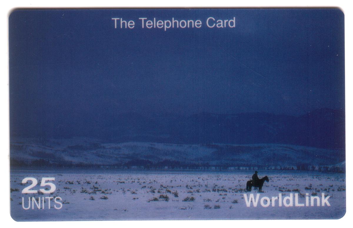 Winter night scene with lone rider on horseback, deep blue sky, snowy landscape, mountain backdrop, 25 units, WorldLink branding, collectible telecommunications item. |
