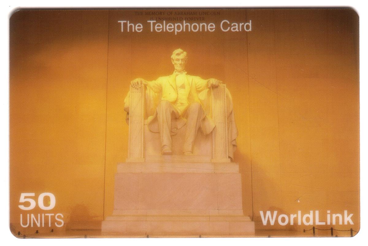 The card is marked with a value of 50 units in white text positioned in the lower left corner. The brand name "WorldLink" appears in the lower right corner in white lettering. At the top center of the card, the text "The Telephone Card" is printed in white, with smaller text above it reading "In memory of Abraham Lincoln."