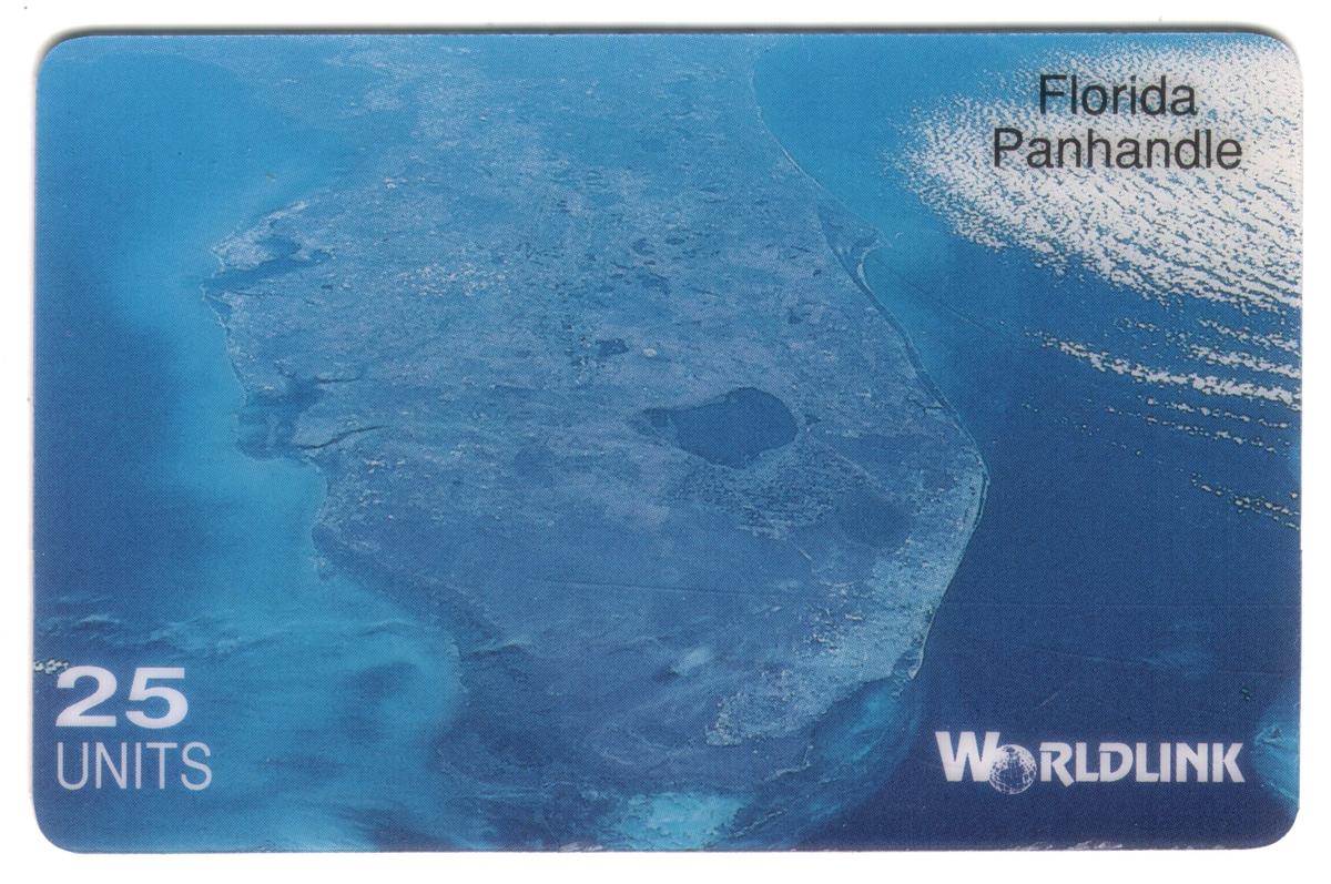 The card includes the text "Florida Panhandle, USA" prominently displayed. It also carries the logo and name "WorldLink Commun." in the bottom area, identifying the issuer. The card is designed for use as a collectible phone card, reflecting travel and scenic interest in the Florida Panhandle.