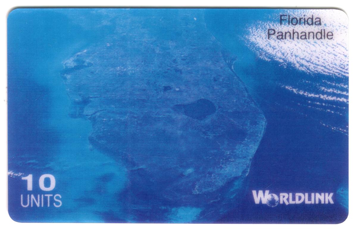 Collectible Florida Panhandle phone card featuring aerial view, blue-green water and land, 10 units, Worldlink branding, glossy finish, minimalistic design. |