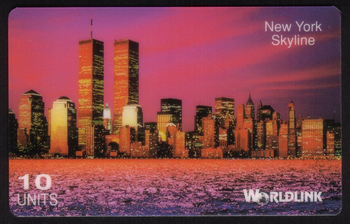 This collectible phone card features a vibrant image of the New York City skyline prominently showcasing the Twin Towers of the World Trade Center. The scene is set against a solid red background, which creates a striking contrast with the detailed architectural silhouette of the city. The Twin Towers, standing tall in the middle of the composition, are the focal point of the card, symbolizing an iconic and well-known international landmark.