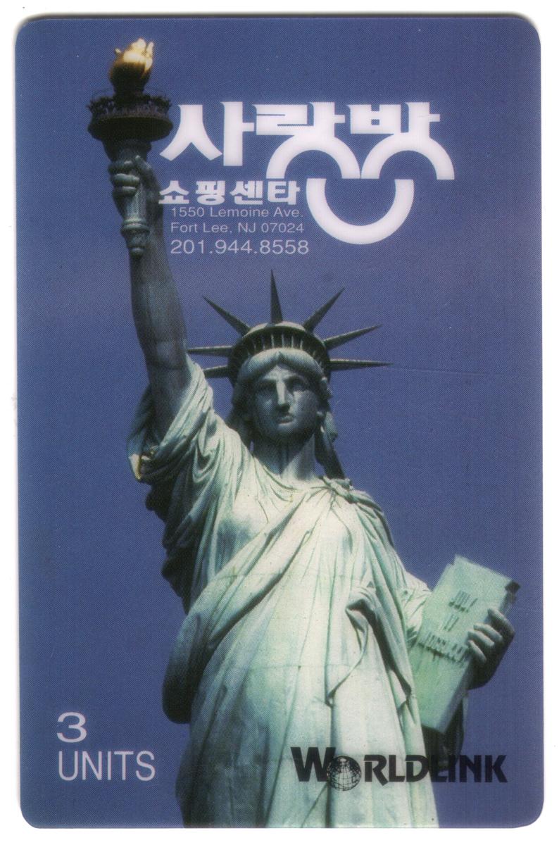 This phone card connects American historical landmarks and icons with Korean language and contact information, reflecting a cultural link between the United States and Korean-speaking communities. It is an official-looking collectible item promoting the Statue of Liberty as a symbol of American history.