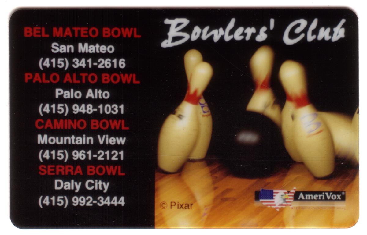 This collectible chip card features a colorful design themed around bowling. The card prominently displays a Pixar Bowling Ball and several bowling pins arranged near it. The background includes a vibrant bowling alley scene with graphical elements that highlight the sport of bowling. The card includes text references to multiple bowling alleys and locations in California such as San Mateo, Palo Alto Bowl, Mountain View, Daly City, Bel Mateo Bowl, Camino Bowl, and Serra Bowl.