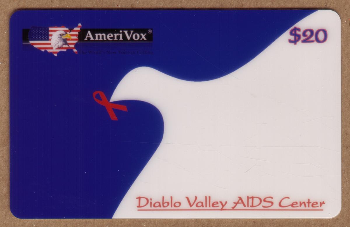 This collectible phone card features a prominent red ribbon shaped like a dove, symbolizing awareness and support for AIDS-related causes. The card is linked to the Diablo Valley AIDS Center, an organization dedicated to providing nutritional support and fostering social interaction for individuals affected by acquired immune deficiency syndrome (AIDS) and other related diseases. The design of the card conveys a message of hope and solidarity in the fight against viruses and diseases.
