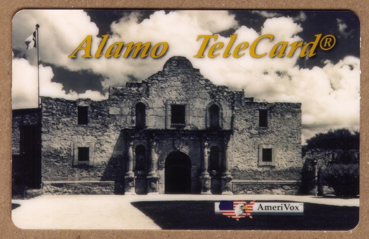 At the top of the card, the text "Alamo TeleCard®" appears in gold lettering, identifying the theme of the collectible item. In the lower right corner, the AmeriVox logo is present, featuring a small image of a U.S. map with an American flag overlay, signifying the card's connection to American history and Americana collectibles. The design overall reflects the importance of The Alamo as a National Monument and symbol of Texan history.