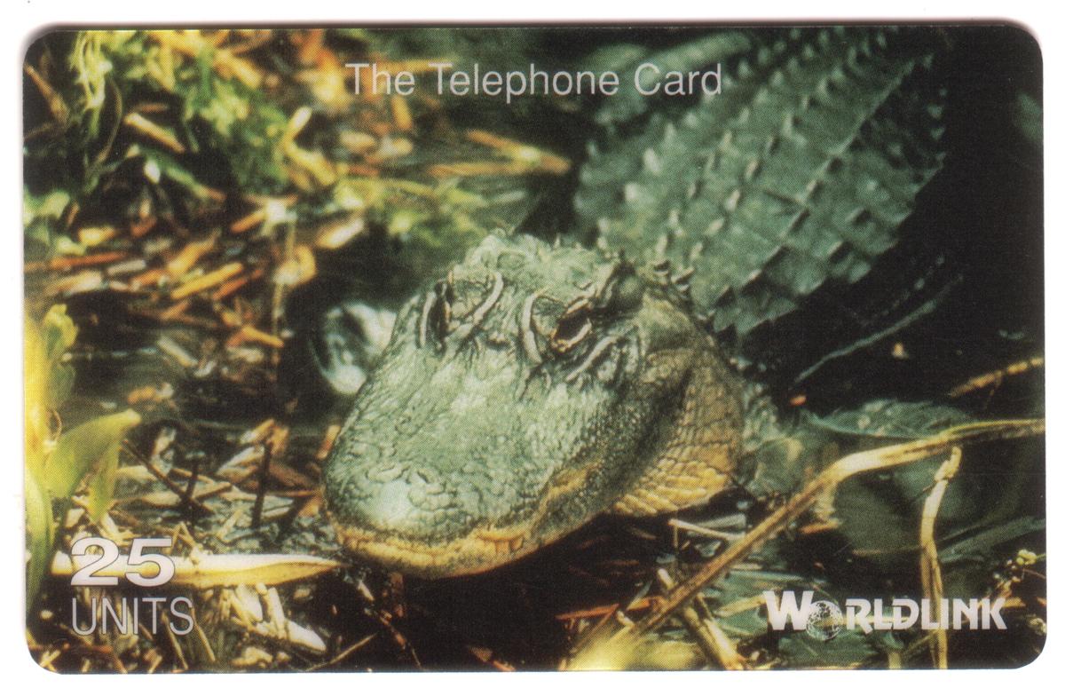 The card bears the text “25u Alligator In Swamp (Close-up)” in English, indicating the card’s value. It also includes the word “SPECIMEN,” which identifies this particular edition. The company name “WorldLink Commun.” appears on the card, signifying the card issuer. The design emphasizes travel, tropical environments, sightseeing, wild animals, reptiles, aquatic wildlife, and nature, aligning with the themes showcased in the photographic image.